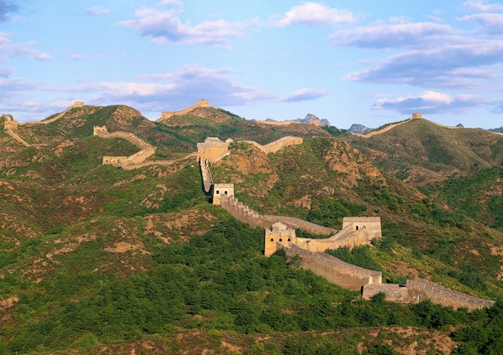 約公元前220年,一統(tǒng)天下的秦始皇,將修建于早些時候的一些斷續(xù)的防御工事連接成一個完整的防御系統(tǒng),用以抵抗來自北方的侵略。在明代(公元1368~1644年),又繼續(xù)加以修筑,使長城成為世界上最長的軍事設(shè)施。在文化藝術(shù)上的價值,足以與其在歷史和戰(zhàn)略上的重要性相媲美。