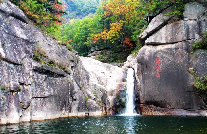 黑龍?zhí)蹲湓诿茉瓶h石城鄉(xiāng)鹿皮關(guān)北面的一條全長4公里,水位落差220米的峽谷里,距北京100公里。春花、秋月、平沙、落雁、曲、疊、沉、懸潭等十八個名潭撒落在幽深振奮峽谷里,千姿百態(tài),各領(lǐng)風(fēng)騷。