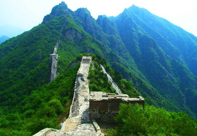 是北京一段最險峻、雄奇的長城,自然風(fēng)化嚴(yán)重,沒有任何人工修飾,自牛犄角邊、南大樓、鬼門關(guān)、東西縮脖樓、東西油簍頂,箭扣梁、、將軍守關(guān)、天梯、鷹飛倒仰、北京結(jié)到九眼樓(望京樓)綿延20多公里,充分展現(xiàn)了長城的驚、險、奇、特、絕,能領(lǐng)略到原汁原味的古老的長城景觀。天梯、鷹飛倒仰、北京結(jié),九眼樓、一段路最險,從東向西走稍好一點,從西向東走更艱難。遇見倒塌的路段要繞出長城,在城墻的石縫里插上樹枝做梯子,再爬墻進(jìn)去;天梯是一段70度陡坡、70-80米長的長城,版權(quán)所有山東聊城聊之旅國際旅行社有限公司,轉(zhuǎn)載必究!最窄處60公分寬,臺階40-50公分高、15公分臺面,要四肢并用地爬;鷹飛倒仰有一處長城直立倒塌,要南轅北轍地繞道迂回過去,下山70-80度陡坡,要不抓住樹枝,很難站住;北京結(jié)到望京樓一段在長城里,東側(cè)是城墻,西側(cè)是灌木,沒有臺階,非常難走。