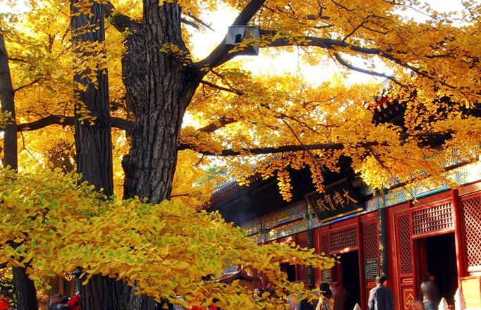 寺內(nèi)有雌雄銀杏,東側(cè)為雌,結(jié)果但不開(kāi)花;西側(cè)為雄,開(kāi)花但不結(jié)果,奇特之處在于西側(cè)的雄性銀杏,樹(shù)高30米,主干四周,生有十株側(cè)干,據(jù)說(shuō)自唐代栽了這兩株銀杏以來(lái),每改換一個(gè)朝代,就多長(zhǎng)出一株側(cè)干,這只是一種傳說(shuō),但銀杏的樹(shù)齡已在千年以上,則是確切無(wú)疑的。大雄寶殿后有“紫藤寄松”,大雄寶殿后面的西側(cè)生長(zhǎng)有一株樹(shù)齡數(shù)百年的平頂松,樹(shù)高6米余,有9個(gè)分枝,平直地伸向東側(cè)的四面八方,下面用十余根木料支撐,平頂松附近,有兩株碗口粗的紫藤如龍蛇飛舞一樣繞生在松樹(shù)上,形成一個(gè)巨大的傘蓋,遮蔭面積400多平方米,每年春末夏初,藤蘿花如串串紫色珍珠一樣,掛滿(mǎn)枝頭,碧綠的松枝與紫色的藤花相繼爭(zhēng)奇斗艷,令游人嘆為觀止。此乃紅螺寺一大景觀。
