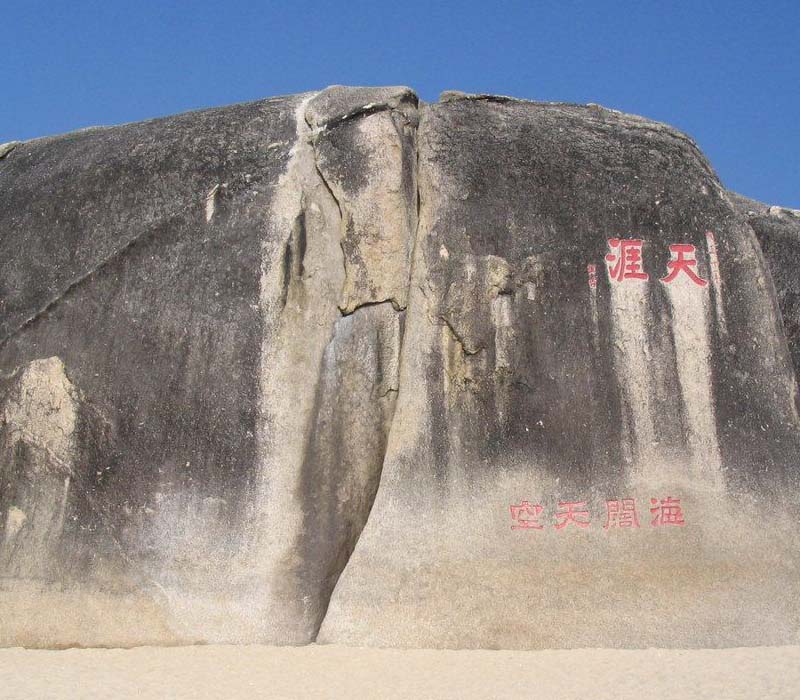 “天涯海角”并非地理位置上的盡頭,而是意境意義上的天涯海角。史載,“天涯”兩字為清雍正年間崖州知州程哲所題,銘刻在一塊高約10米的巨石上。(巖石下方有郭沫若詠“天涯海角”的三首詩(shī)題刻)“海角”兩字刻在“天涯”右側(cè)一塊尖石的頂中端,據(jù)說是清末文人題寫。