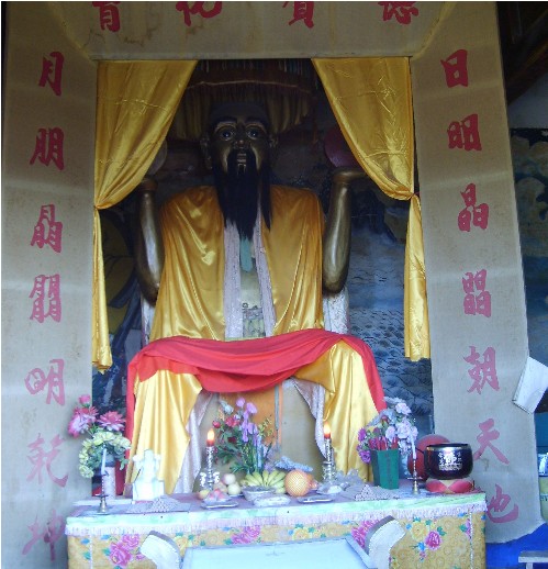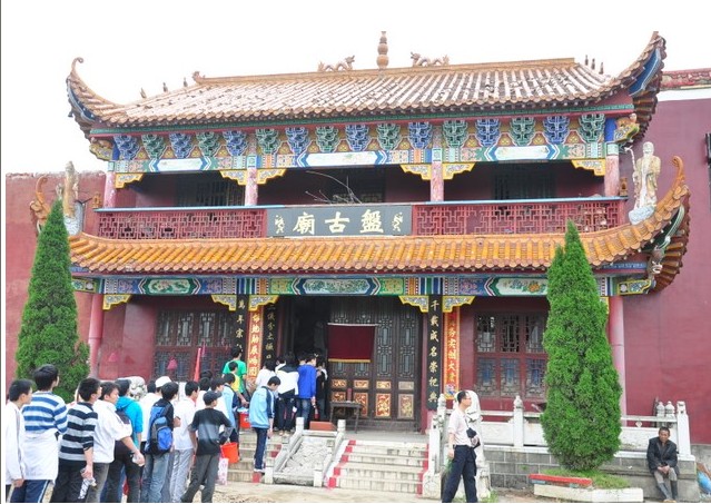 地處河北省滄州市北的青縣城南6公里有村曰“大盤古”,村西有座盤古廟。盤古廟始建于元世祖至元十五年(1278年),明弘治和崇禎年間曾重修,清康熙二十七年(1688年)因河流沖刷,設(shè)于秋祠西南重建,均有碑記。據(jù)文獻(xiàn)記載和民間傳說,當(dāng)年的盤古廟狀似北京的故宮三殿,石、磚、木結(jié)構(gòu),琉璃瓦蓋頂,金碧輝煌,蔚為壯觀。前殿高三丈六尺,象征一年360天;臺(tái)階18級(jí),為18層地獄之說;飛檐椽子108根,按36天罡、72地煞而布;每根椽頭系銅鈴一枚,照工、商、角、征、羽五音而置,有所謂“風(fēng)搖鈴響天動(dòng)樂,光照殿頂?shù)厣x”之說。殿內(nèi)有身披樹葉,手托日月的鐵鑄涂金盤古像,高一丈零八寸。中殿塑有南海觀音像,股坐蓮盆,金童玉女立兩側(cè)。版權(quán)所有山東聊城聊之旅國(guó)際旅行社有限公司,轉(zhuǎn)載必究!后殿設(shè)老君、孔子、龍王三塑像,殿前有合抱粗的合歡樹兩株,殿后鐵磬懸于古槐??上ПP古廟在1947年毀于戰(zhàn)火。九十年代,當(dāng)?shù)厝罕娊M織起來修復(fù)盤古勝跡,以滿足來此朝圣拜祖的人流尋訪。