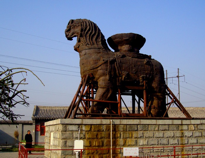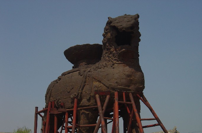 滄州鐵獅子位于滄州市政府駐地東南偏北16.5公里。坐落在東關(guān)村西0.5公里處。鐵獅身高5.78米,長(zhǎng)5.34米,寬3.17米,體重約50噸。背負(fù)巨盆相傳是文殊菩薩蓮坐,獅身向南,頭向西南,兩左腳在前,兩右腳再后,呈前進(jìn)狀,姿態(tài)雄偉,昂首闊步,徐徐如生鐵獅是我國(guó)大型的驚巧鑄鐵工藝。也是我國(guó)著名發(fā)源的古跡。距今已有一千多年的歷史,它充分的顯示出我國(guó)古代勞動(dòng)人民的智慧和藝術(shù)才華。解放后鐵獅子受到了黨和政府的重視與保護(hù),國(guó)務(wù)院首先把它列為全國(guó)第一批重點(diǎn)文物保護(hù)單位,并且對(duì)它進(jìn)行各種的修繕。