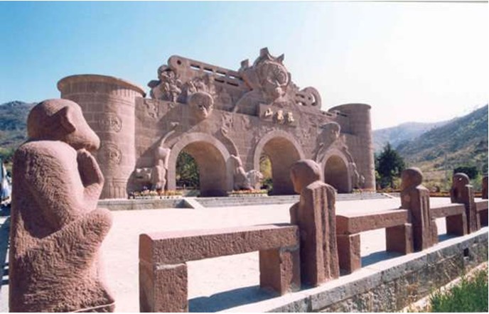 花果山山門建成于1996年7月1日。一到山門口,《西游記》氛圍便撲面而來。山門是在傳統(tǒng)古城門的骨架上,用現(xiàn)代表現(xiàn)手法加以渲染。正門上首為孫悟空的頭像,背襯圓形圖案,象征功德圓滿,法輪常轉(zhuǎn)。北側(cè)有唐僧師徒4人西方取經(jīng)的浮雕,下方有6只圓雕雄獅把門,廣場四周有109只石猴迎賓。山門背面的匾額上鐫“東勝神洲”四字,為中國書法家協(xié)會代主席沈鵬先生題寫。透過中間的門洞,可看到松林中吳承恩雕像。