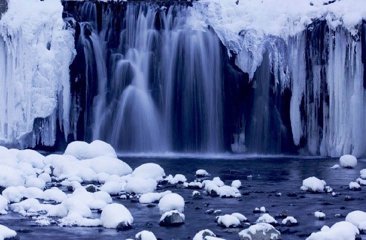 遠(yuǎn)觀吊水壺瀑布如飛簾掛壁,白練當(dāng)空;近看垂珠濺玉,如煙似霧。夏日里四處飛濺的浪花,忽而白如飛雪,似錦帛飄逸,忽而五色繽紛,賽飛虹流瑩;冬天如巨大結(jié)晶的冰川倒懸山崖,雪掩溪流沿冰縫間石壁沖下,樹枝上形成層層霧淞,林中呈現(xiàn)一片玉樹銀花的壯美景象。