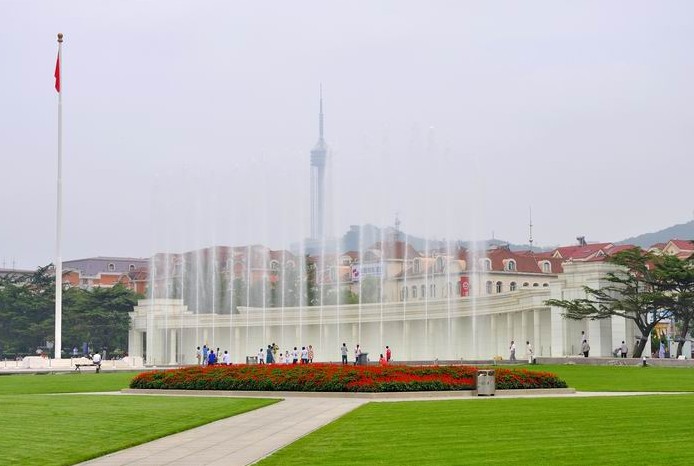 主噴泉前方的國旗升起臺(tái)面積為9.9x9.9米,寓意1999年是大連市建市100周年。旗臺(tái)上的國旗桿長26米。