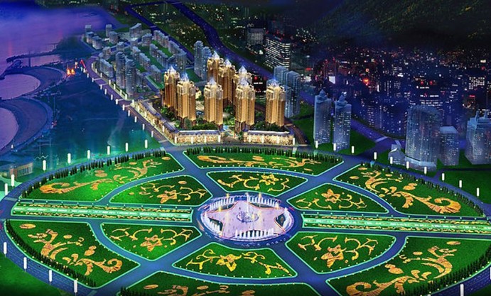 從廣場(chǎng)中央大道中心點(diǎn)往北500米是會(huì)展中心;往南是百年城雕廣場(chǎng),500米外是藍(lán)色的大海。中央大道紅磚鋪地,兩側(cè)綠草如茵,每隔20米設(shè)一個(gè)航標(biāo)燈造型的石柱燈,象征著中國(guó)正面向大海,走向世界。