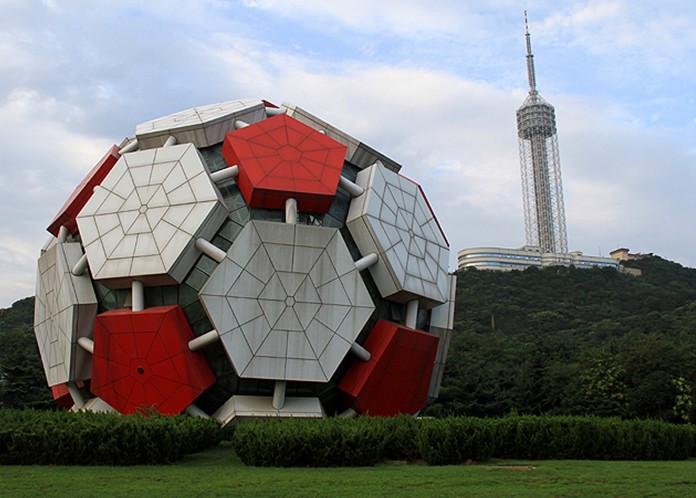 球形建筑藝術(shù)館里面陳列著大連各種建筑圖形,因?yàn)榇筮B是足球城,所以它的外形便造成了紅白相間的球體。球體直徑19.6米,高21米。