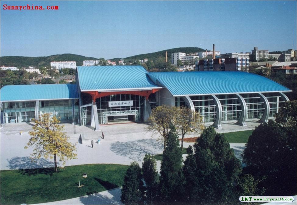 坐落在風(fēng)景秀麗的旅順太陽溝景區(qū)的博物苑內(nèi)。占地面積14000平方米,建筑面積5000平方米,總投資2300萬元。整體建筑為流線型鋼混框架結(jié)構(gòu),建筑形體以實墻與大玻璃幕墻圍合而成,屋頂最大高度17.2米,最大跨度為46.5米,該館是大連市重點旅游工程項目之一。