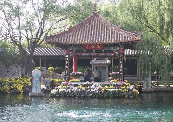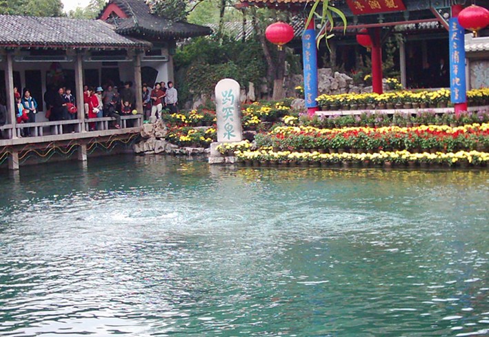 泉水一年四季恒定在攝氏18度左右,嚴冬,水面上水氣裊裊,像一層薄薄的煙霧,一邊是泉池幽深波光粼粼,一邊是樓閣彩繪,雕梁畫棟,構(gòu)成了一幅奇妙的人間仙境。