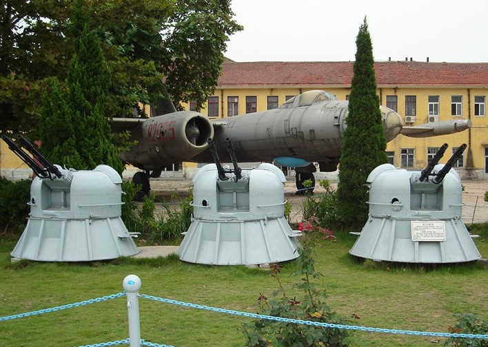 武器裝備展區(qū)建在院內(nèi)廣場上。廣場整齊陳列著各種退役的武器裝備,按照武器類型分艦艇、導彈、飛機、雷達、火炮5個展群和一個特殊展區(qū)。導彈展群內(nèi)擺放著各種功能的導彈,小如炮彈,大如飛機,其中一種紅旗地對空導彈在60年代曾3次擊落美制U一2無人駕駛高空偵察機。艦艇展群中有一艘周恩來總理于1957年8月4日在膠州灣檢閱駐青島海軍部隊時乘坐的02型木殼魚雷快艇。特殊展區(qū)內(nèi)陳列著一架肖勁光司令員乘坐的伊爾一14飛機,此機于1960年至1991年服役期間,曾多次接送過首長和國際友人,并參加過多次搶險救災任務。