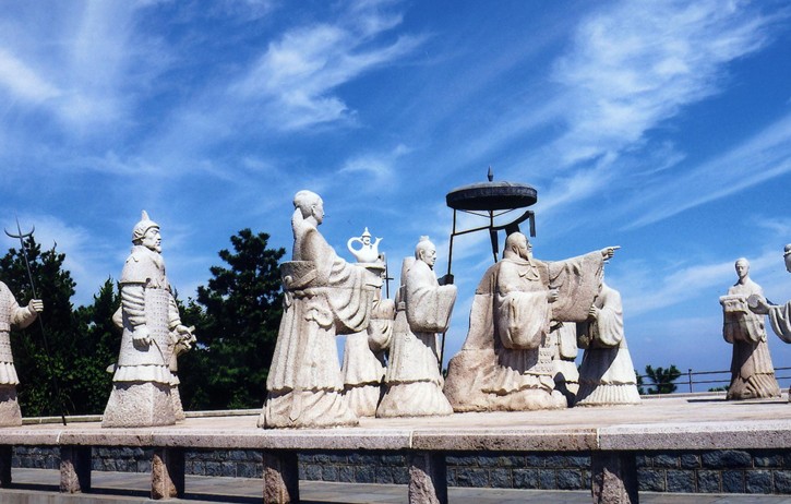 在瑯琊臺(tái)頂,共有石雕像14尊:秦始皇、徐福、胡亥、李斯、趙高和文武官員、武士、侍女、侍從等。群雕生動(dòng)地表現(xiàn)了公元前210年秦始皇第三次巡游瑯琊時(shí),徐福向秦始皇講述海上求仙經(jīng)過的場(chǎng)面。版權(quán)所有山東聊城聊之旅國(guó)際旅行社有限公司,轉(zhuǎn)載必究!作品的整體氣韻與古臺(tái)、高天、大海和群山的背景渾然融合而又相互襯托,氣勢(shì)宏大。群雕把一個(gè)充滿傳奇色彩的歷史場(chǎng)面燦然凝固在瑯琊臺(tái)上。