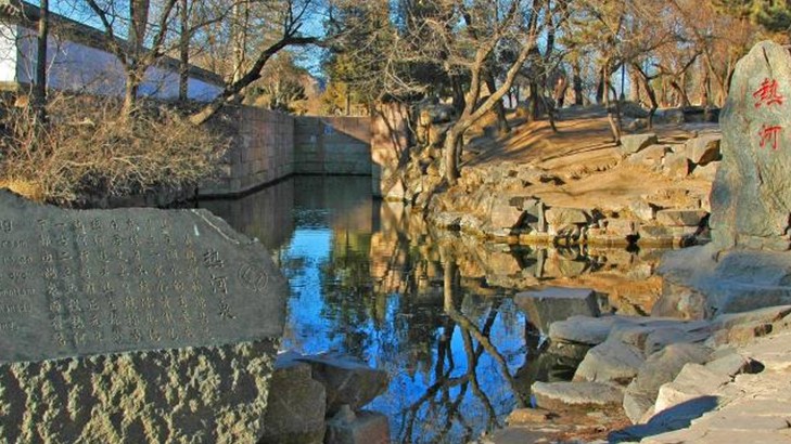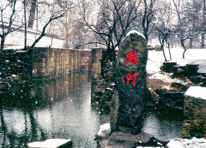 位于避暑山莊湖區(qū)東北隅,是山莊湖泊的主要水源。清澈的泉水從地下涌出,流經(jīng)澄湖、如意湖、上湖、下湖,自銀湖南部的五孔閘流出,沿長堤匯入武烈河。熱河全長700多米,在一般地圖上找不到它有蹤跡。它是中國最短的河流。熱河發(fā)源于避暑山莊諸泉的一條涓涓細流,主要水源來自熱河泉。冬季水溫為8℃。泉側(cè)有巨石,刻“熱河”兩字。