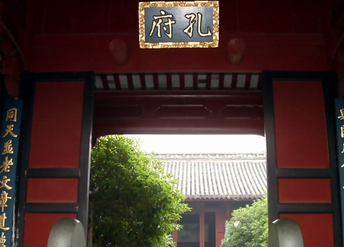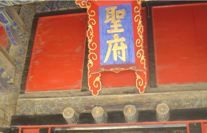 圣府大門(mén)就是曲阜孔府的大門(mén),圣府為三間五檁懸山式建筑,匾書(shū)“圣府”二字,是明朝嚴(yán)嵩所書(shū)。門(mén)兩邊有對(duì)聯(lián)一幅“與國(guó)咸休安富尊榮公府第,同天井老文章道德圣人家”,其中“富”字少上面一點(diǎn),寓“富貴無(wú)頭”,“章”字一豎通到上面立字,寓“文章通天”,此聯(lián)概括出千百年來(lái)“圣人家”。