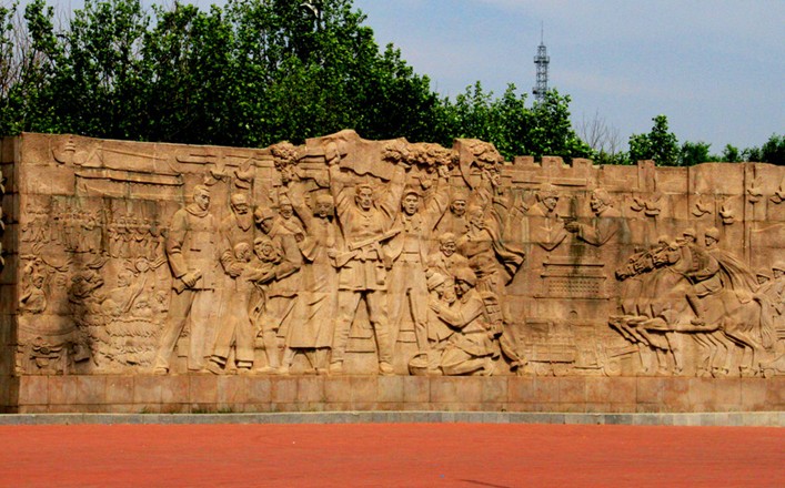 大廳正中央的鑄銅雕像《走向勝利》,表現(xiàn)了中共中央毛澤東和劉少奇、朱德、周恩來、任弼時五位書記的領(lǐng)袖風采;墻屏上毛澤東主席關(guān)于平津戰(zhàn)役作戰(zhàn)方針的浮雕手跡熠熠生輝;環(huán)周巨幅壁畫《勝利交響詩》反映了東北、華北兩大區(qū)軍民英勇奮戰(zhàn)、奪取戰(zhàn)役勝利的宏大場面。