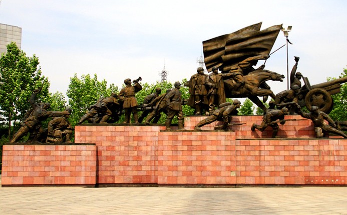 紀念廣場總體環(huán)境藝術(shù)以勝利為主旋律。兩根高大花崗巖圓柱構(gòu)成勝利門,柱頂分別佇立著人民解放軍東北野戰(zhàn)軍和華北軍區(qū)部隊戰(zhàn)士雕像。兩壁反映軍民團結(jié)奮戰(zhàn)、歡慶勝利的花崗巖浮雕墻分列勝利門兩旁。廣場中央豎立著高64米的勝利紀念碑,不銹鋼三冷刺刀直插云霄。廣場東西兩側(cè)的大型鍛銅群雕,烘托出人民戰(zhàn)爭的磅礴氣勢。