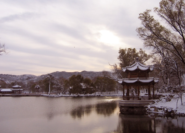 每逢中秋佳節(jié)之際,天高氣爽,登臨“月臺(tái)”賞月,但見園內(nèi),老樹蒼勁,枝杈縱橫。一輪明月冉冉升起,把一片銀輝灑向大地,山莊頓時(shí)銀裝素裹,更顯得清澈靜謐。文津閣假山的造型藝術(shù),集中了米翁寶晉齋和范氏天一閣之長,運(yùn)用傳統(tǒng)疊山技法,結(jié)合北方雄壯的特點(diǎn),風(fēng)格一反南方小巧玲瓏之態(tài),而是雄偉、渾厚、氣勢(shì)磅礴的藝術(shù)作品。