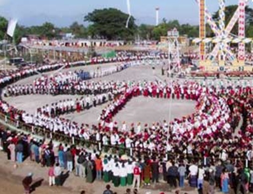 1958年,在密支那修建了永久性的目瑙祭壇,嗣后每年都在這里舉行全邦性的目瑙會。目瑙埸建在江邊,埸地寬闊,設(shè)有西門和北門。兩門頗有民族特色,是一個模子倒出來的。門枋是一對象牙抬著一扇铓,兩側(cè)是四根交叉的雌雄目瑙柱,門衛(wèi)是兩位手持長刀和梭鏢的克欽先民武士。目瑙祭壇與德宏的大同小異,德宏的是四根直立的雌雄柱,中間是兩把雌雄刀;密支那的是十根交叉的雌雄柱,中間有一根橫桿固定其交叉部位。其共同點是基座均為犀鳥,雌柱上繪的蕨葉藤和雄柱上的三角圖案相似,中間兩根雌雄柱頂端各繪著月亮和太陽,南側(cè)建有祭鬼崗樓。目瑙柱北邊矗立著一座龐大的目瑙房,這是一所典型的克欽族現(xiàn)代建筑,不僅氣派豪華,而且極富民族特色。尤其是陽臺上的7根粗實巨大的中柱,繪滿了豐富多彩的民族圖案,它象征著克欽族由7個支系組成,在牛頭文化精神的引領(lǐng)下,克欽族將獲得新生。