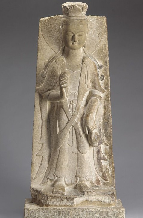 石像高3.9米,腰圍2米,手長40厘米,背北面南,立于50厘米高的石雕蓮花座上。石像刻線明顯,披巾搭胸,細腰束帶。雕線棱角分明,刀法洗煉,在個體石像中甚為罕見,為我國古代石雕珍品?,F(xiàn)為省級重點文物保護單位。