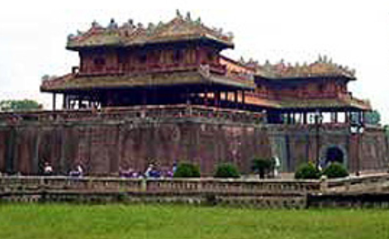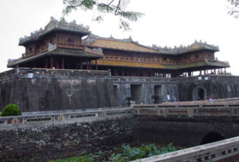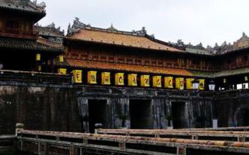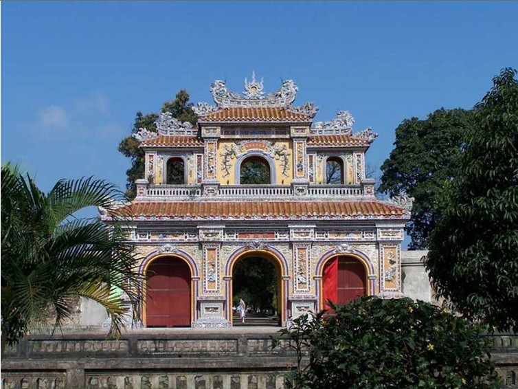 越南順化故宮正門。規(guī)模比中國北京故宮的午門小,但其式樣基本一樣。平面呈冂形,下有高大的磚石墩臺,臺正面圍以垛墻。墩臺有5門,正中門高5.32米,寬3.28米,門正中上方有“午門”兩個大字。當初字外包金,1943年12月10日包金被竊。墩臺上建樓5座,名五鳳樓,樓分兩層,氣勢巍峨。下層正中是“御座”。上層為各宮人觀禮之所。當時,午門只在慶典節(jié)日開放。午門也是阮氏王朝被埋葬的見證,1945年8月30日阮朝末代皇帝被迫在此正式宣布遜位,并把金印和寶劍交給越南臨時政府代表團。午門建于阮朝明命十四年(公元1833年),啟定三年(1921年)重修??箲?zhàn)期間遭炮火破壞,現(xiàn)已修復(fù)。以前,阮朝嘉隆初年曾在午門現(xiàn)址建有南闕臺。