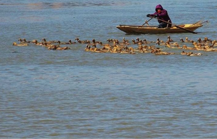 金風(fēng)送爽的秋天,正是湖上收獲的季節(jié)。漁舟來往穿梭,鸕鶿水下翻騰。喜看船艙中,不是活蹦亂跳的魚蝦,就是潔白似玉的白蓮藕和沉甸甸的香稻。湖區(qū)人民沉浸在豐收的喜悅之中。