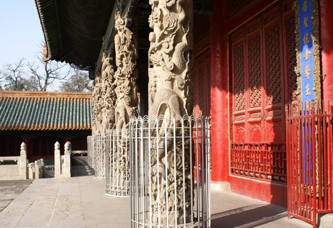 大成殿為孔廟之主殿,唐代稱“文宣王殿”。“大成”乃因宋徽宗趙倩尊孔子為“集古圣先賢之大成”而改名為“大成殿”,并御書匾額。大成殿不僅殿宇宏大,裝飾華麗,為全國孔廟之冠,而且此殿前檐十根雕龍石柱,龍姿飛揚,為宮殿建筑中前所未見,連紫禁城的龍柱也相形見細(xì)。據(jù)傳每當(dāng)皇帝前來祭孔時,要將龍柱用紅縷包裹起來,以免皇帝發(fā)現(xiàn),犯殺頭之罪。殿內(nèi)正中奉把孔子塑像,兩旁為四配和十二哲的塑像。殿前東西民廊原供孔門弟子及儒家歷代先賢,現(xiàn)已辟為陳列室,陳列著歷代碑刻,為書法、繪畫、雕刻的藝術(shù)寶庫。寢殿后的圣跡殿,藏有明代石刻連環(huán)畫120幅,記述了孔于的業(yè)跡。故宅井后的魯壁為秦始皇焚書坑儒時,孔子第九代孫孔鮑收藏《尚書》、《禮記》、《論語》、《孝經(jīng)》等的夾墻,人們?yōu)榱思o(jì)念孔鮑保護(hù)古代文化的功績,特地修建了這個魯壁。