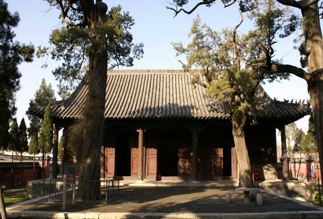 在孟廟寢殿前露臺(tái)和甬道之上,有3株古檜。據(jù)《三遷志》記載,為北宋宣和年間所植,距今已有近900年的歷史,是孟廟內(nèi)最為古老的樹木之一,現(xiàn)依然青翠蓊郁,茁壯茂盛。奇妙的是其中一株古檜,不僅樹頂干枝造型為“鹿回頭”(林默涵語),頗為奇特,而且在樹干之上的鳥洞中寄生出數(shù)株枸杞,枝繁葉茂。夏秋之際,碧綠的枸杞葉簇?fù)碇t紅的果實(shí),迎風(fēng)搖曳,妙趣橫生,煞是喜人。