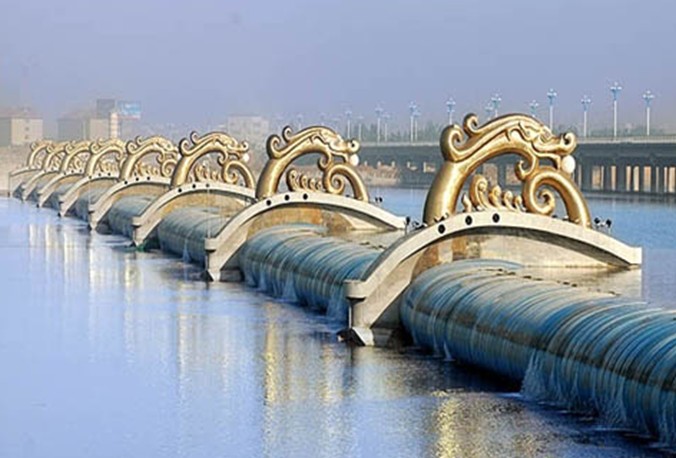 桃園橡膠壩位于南坊新城區(qū)東側(cè),版權(quán)所有山東聊城聊之旅國際旅行社有限公司,轉(zhuǎn)載必究!沂河北大橋下游100米處, 2005年1月開工建設(shè),2006年6月建成蓄水, 樞紐總長度1113.50米,主要由橡膠壩及供排水系統(tǒng)、左岸船閘和右岸溢流堰組成。其中橡膠壩全長783.2米,壩高4.5米,壩袋共10節(jié),每節(jié)凈長77米,船閘總長167米,凈寬8米。橡膠壩墩上設(shè)計(jì)有9條雕塑龍,每條長約9.5米,高約4.5米,龍?bào)w為金黃色,龍嘴、龍眼由大型燈泡裝飾而成的夜明珠構(gòu)成,龍身配有近、遠(yuǎn)光燈,氣勢雄偉,光彩照人,尤其夜晚寶珠熠熠生輝,龍?bào)w變幻迷離,在沂河北大橋的映襯下,形成魚躍龍門之勢。