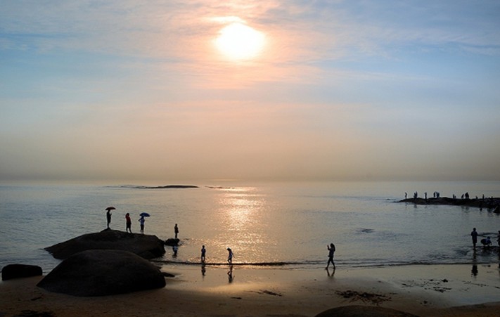 3、老爺頂觀日出 :為阿掖山主峰,其石“巍峨峭拔,紱繞如椅望”。立于其上,向東可觀日出扶桑,飄渺三島(即前三島),南視“秦山(海州灣內(nèi)——島嶼)海市”為佳景,令人嘆絕。夜眺景色更佳,北望日照港十萬(wàn)噸級(jí)碼頭如龍臥波;南望嵐山港燈火輝煌,燦若繁星;遠(yuǎn)望連云港巨輪穿梭,燈火通明,一山觀三港,唯有此處。