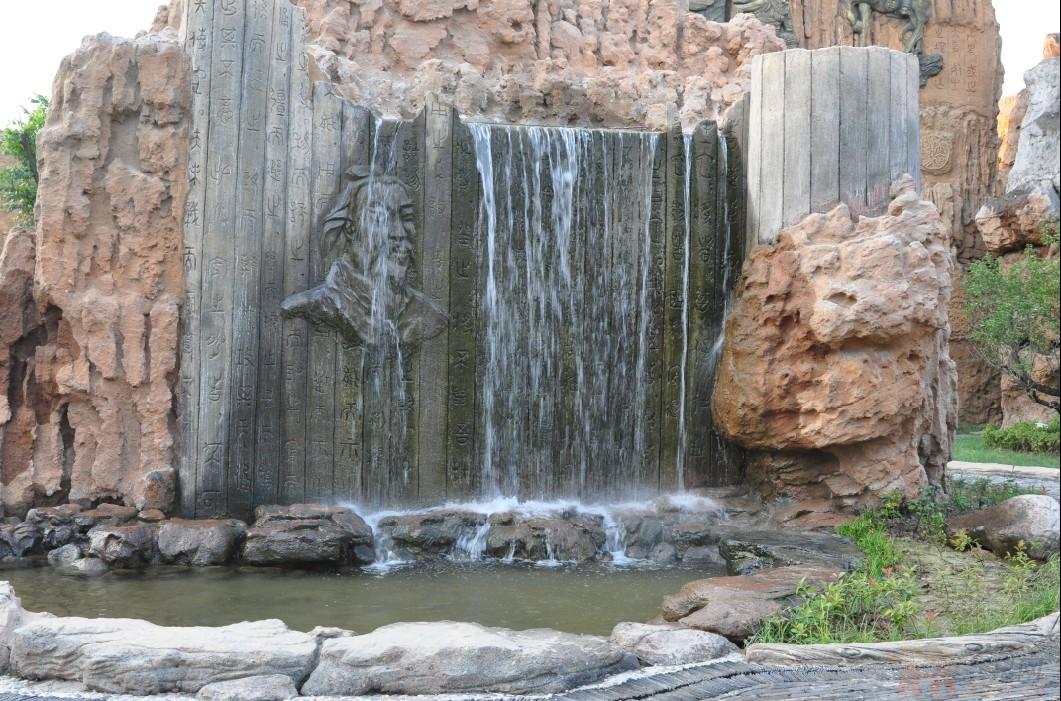 游客穿過春秋版圖廣場來到儒家區(qū),一座23.8米高的孔子像依山而建,形態(tài)逼真。山上結(jié)合石雕與文字表述孔子一生的經(jīng)歷。地面上則采用古書竹卷的形式進行布局,刻論語于其上,72賢人弟子坐落于此,再現(xiàn)孔子“杏林授徒”的春風(fēng)和煦景象。