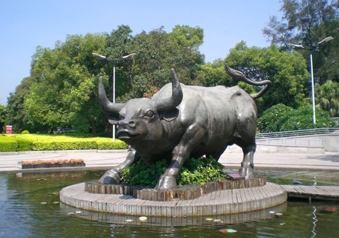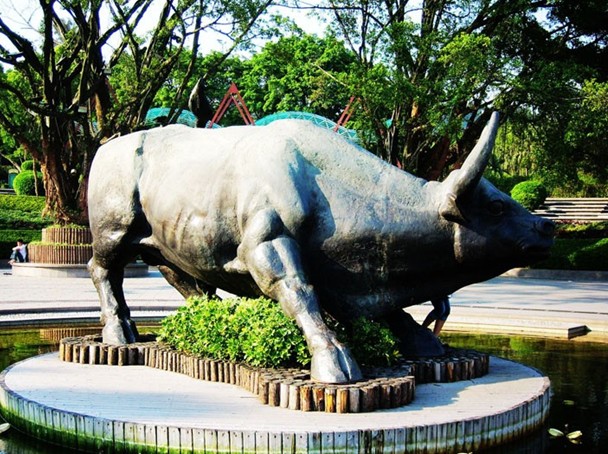 金牛山海拔163米,疊水廣場因泉水層層相疊流動而得名,廣場的占地面積為5400平方米,另外還有1200平方米的專用停車場,在疊水廣場正中央擺放的是金牛雕塑。這尊健碩有力、憨態(tài)可掬的金牛雕塑是中央美院陳科副教授特意為公園精心雕刻而成,體高8.8米,長6米,重6噸,整尊雕刻由精銅注雕而成。