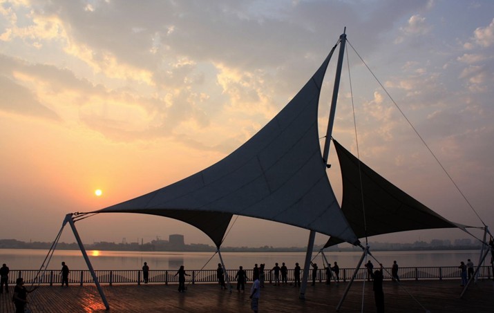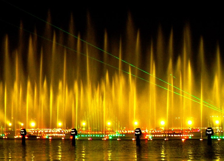 位于菱湖風(fēng)景區(qū)北岸,總建筑面積102000平方米,沿湖岸的水面上建有木質(zhì)親水平臺(tái),平臺(tái)南側(cè)設(shè)有水景表演系統(tǒng),噴泉水幕總長(zhǎng)380米,寬約100米,最大噴高128米,噴頭近3000個(gè),水下彩燈5000盞,是國(guó)內(nèi)目前規(guī)模最大的水幕電影系統(tǒng)之一。