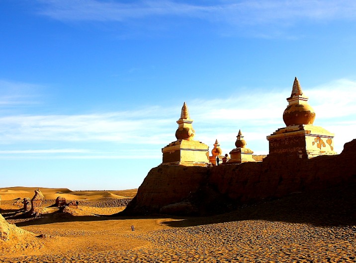 在黑水城眾多的建筑中,宗教建筑是這座古城的一大特色。黑水城,曾是一個多民族聚居的城市。歷史上曾建造過許多宗教寺院。有佛教、道教和伊斯蘭教等不同的建筑。其中以佛教建筑最多,而且占地面積也最大。版權所有山東聊城聊之旅國際旅行社有限公司,轉載必究!在西北角的城墻上,至今還聳立著5座寶瓶似的佛塔。最高的一座達13米。佛塔是用土坯壘成,雖經數(shù)百年的風沙侵襲,今天依然聳立云端,成為黑水城獨具魅力的標志。