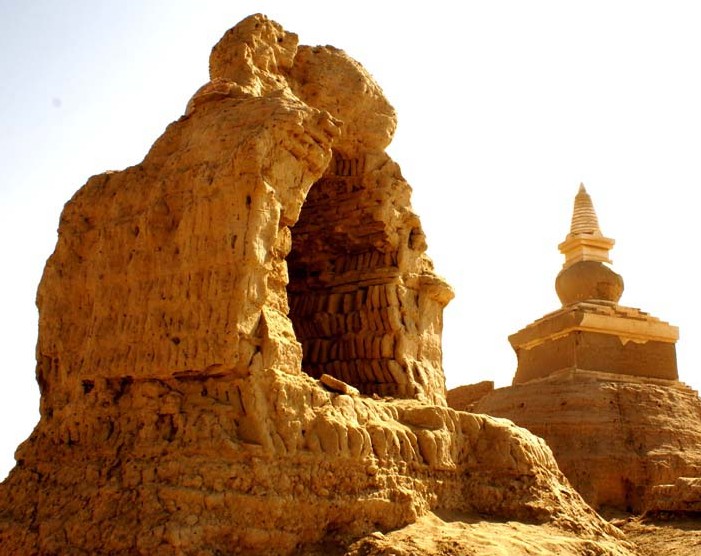 1350年前后,這里的情況發(fā)生了巨大的變化。昔日的綠洲,被沙漠吞噬,變成了一片荒漠。昔日繁華昌盛的黑水城也變成了一座廢城。現(xiàn)在它們的痕跡依稀可辨。磚石,瓦塊,陶瓷殘片,鐵器,雕刻,泥佛,風化的白骨,破裂的石磨,塊壘等當年的遺物。在古城遺址的西北角上,端坐著12米高的西藏覆缽式佛塔,古樸,圓融,安詳,是黑城的標志性建筑。城內,荒涼滿目,流沙下遍布官邸、寺廟和民居的頹垣斷壁,到處都散落著各種瓷器和碎片。黑釉刻花、白釉褐彩,以及鈞瓷和南方的龍泉瓷等等。城外還有幾座殘缺不全的喇嘛塔,像是守城的衛(wèi)士肅然而立。