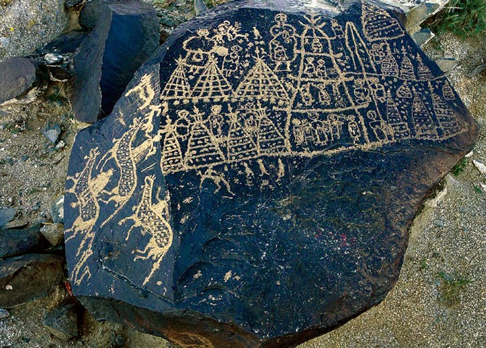 據(jù)巖畫(huà)的色澤和水溫水位資料推測(cè),大約在幾千年前,曼德拉山四周湖水環(huán)繞,是一個(gè)水草豐美的地方。這里,先后曾有匈奴、鮮卑、黨項(xiàng)、蒙古等許多游牧、狩獵民族在山周水草間繁衍生息,留下了可尋的蹤跡。這滿山巖石面上留下的精湛生動(dòng)的藝術(shù)圖案,反映的就是這些民族部落的歷史。