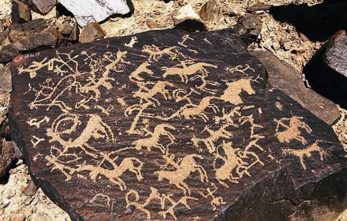 曼德拉巖畫(huà)反映了古代游牧民的生活,巖畫(huà)中表現(xiàn)馬匹、馬鐙、騎馬、騎駝內(nèi)容的作品,是青銅時(shí)代創(chuàng)作的。從考古資料看,馬最早出現(xiàn)于新石器時(shí)代。不過(guò),從巖畫(huà)上還不能判斷是家馬還是野馬。內(nèi)蒙赤峰夏家店出土的騎馬行獵圖中才出現(xiàn)肯定的家馬。這些出土雖然是發(fā)現(xiàn)于內(nèi)蒙東部,可阿拉善巖畫(huà)與之相比,也不會(huì)有太大的時(shí)間差距。