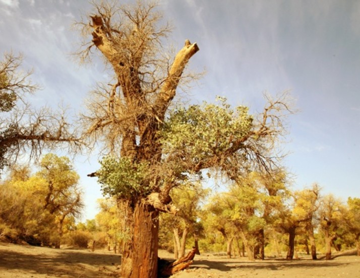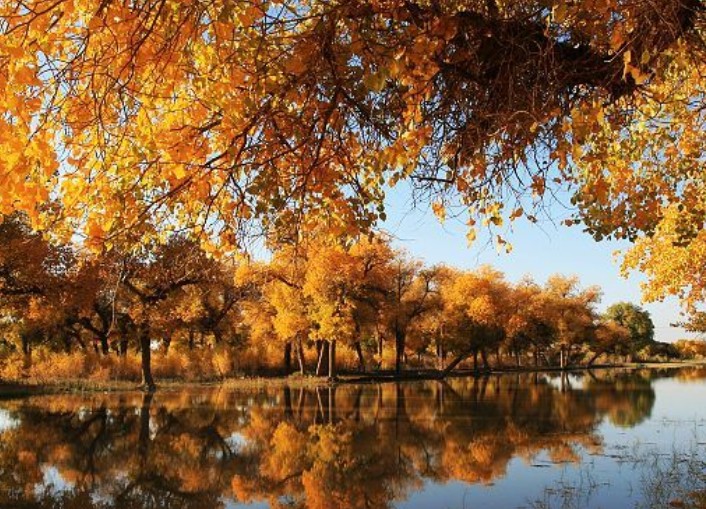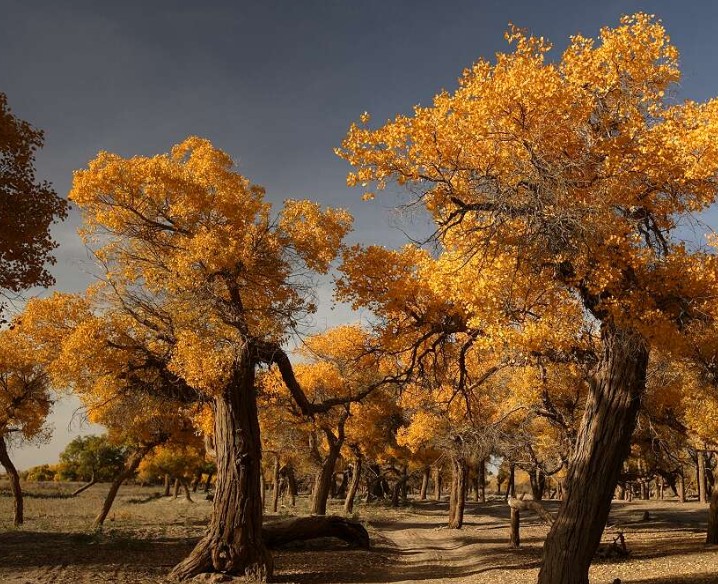 內(nèi)蒙古阿拉善盟的額濟(jì)納旗,現(xiàn)有天然胡楊林45萬畝,是世界僅存的三大胡楊林之一,是國家自然保護(hù)區(qū)和國家森林公園。胡楊林是一個古老的樹種,被譽(yù)為“植物活化石”,有“生一千年不死,死一千年不倒,倒一千年不朽”的美譽(yù)。胡楊,又名“梧桐”,為古地中海殘遺物種,屬落葉喬木,蒙古語稱為“陶來”。胡楊木質(zhì)纖細(xì)柔軟,樹葉闊大清香,耐旱,生命力頑強(qiáng),是自然界稀有的樹種之一。金秋十月,額濟(jì)納是一個童話般的世界。胡楊金葉掛滿枝頭,細(xì)細(xì)看來,在樹枝間竟尋不到一片異色葉子,密密匝匝,金光燦爛,至純至美;遠(yuǎn)遠(yuǎn)望去,一片片金色的胡楊把大漠裝點(diǎn)得如詩如畫,匯集成金色的海洋,吸引著大批國內(nèi)外賓客到此旅游、采風(fēng)、攝影。
