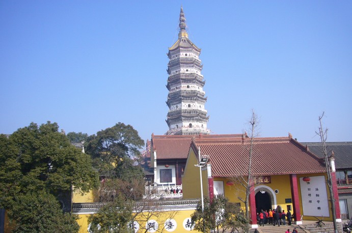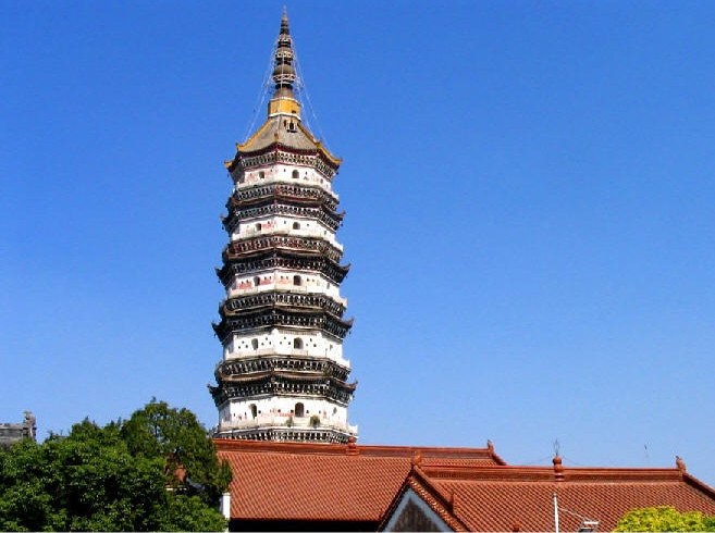 振風(fēng)塔矗立寺中,建于明隆慶四年(1570年),原名“萬佛塔”,是長江流域少見的迎江七級浮圖。遠(yuǎn)看如同一直立的圓錐體,挺拔秀麗,氣勢雄偉;近看由磚石砌成的樓閣式建筑,嵌空玲瓏,莊重華美。該塔七層八角,內(nèi)共有168級臺階,每層有石欄環(huán)衛(wèi)。塔中心為八角瓜皮頂空廳。
