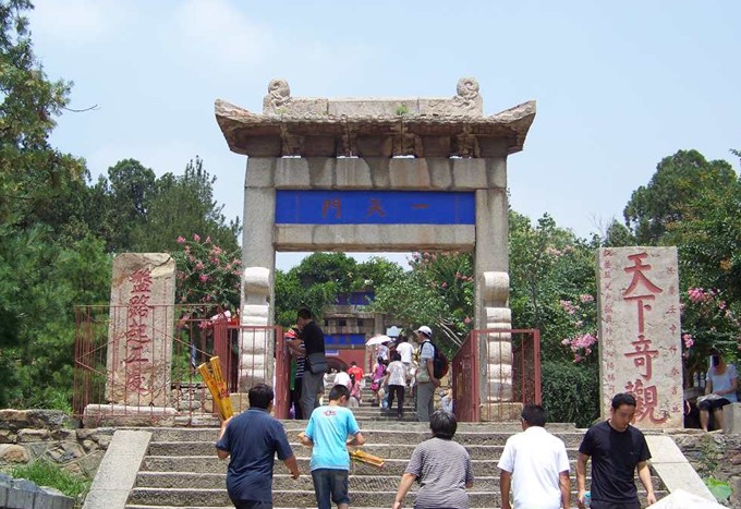 宮前三重石坊形若階梯。前為一天門坊,明代建,參政龍光題額,清康熙五十六年(1717年)巡撫李樹德重建,兩側(cè)有明代人題“天下奇觀”及“盤路起工處”大字碑。中有孔子登臨處坊,明嘉靖三十九年(1560年)巡撫山東都察院右副都御史朱衡等建,嘉靖狀元羅洪先題額并聯(lián):“秦王獨(dú)步傳千古,圣主遙臨慶萬年。”聯(lián)語于1967年被鑿毀。