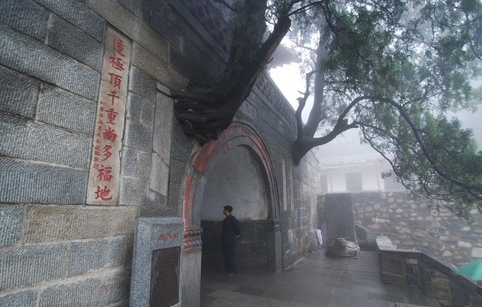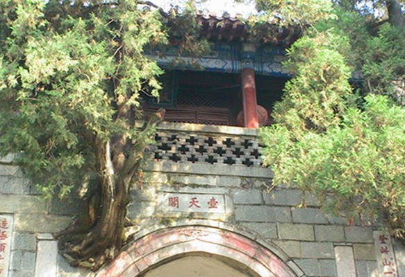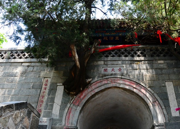清嘉慶六年即公元1801年泰安太守崔映辰題聯(lián):“壺天日月開(kāi)靈境,盤(pán)路風(fēng)云入翠微。”嘉慶二十一年即公元1816年泰安府事廷璐又聯(lián):“登此山一半已是壺天,造極頂千重尚多福地。”這里海拔為800米,大致是泰山高度的一半,門(mén)洞有雙柏自墻中橫生,東西對(duì)峙,盤(pán)旋而上,宛如守護(hù)山門(mén)的雷祖、真武二將軍,堪稱(chēng)奇景。