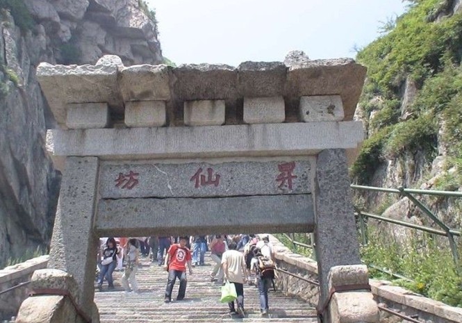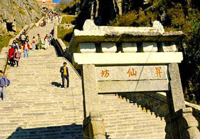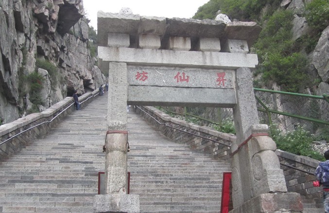 升仙坊位于山東省泰山中路緊十八盤的起始處,為兩柱單門式石坊,額題楷書“升仙坊”。此處山勢陡峻,懸崖峭壁,上臨岱頂天庭,咫尺仙境,似有飄然升仙的意境,故名“升仙坊”。游人至此小憩,每每浮想聯(lián)翩。回視山下,常有騰身云霄之感,舉首仰望,南天門近在眼前,奮力攀登,岱頂在望。 升仙坊位于南天門下。全石雙柱單門式,寬2.82米,通高4.5米,建于雙層方 石基上?;L1.82米,寬0.64米,高0.5米。柱方形,下施滾墩石,獸頭石鼓狀。