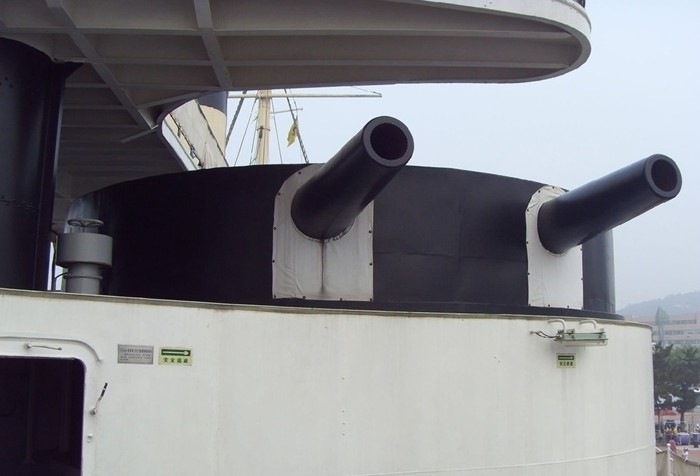 大炮即大口徑炮,是當(dāng)時軍艦的主要武器。“定遠”級的大炮包括4門305毫米口徑和2門150毫米口徑火炮。其中4門德國克虜伯(KRUPP)公司生產(chǎn)的1880式305毫米口徑后膛鋼箍套炮是軍艦的主炮,身管長7625毫米,為25倍口徑,來復(fù)線72條,長4364毫米,藥膛長1406毫米(發(fā)射藥燃燒室),單炮炮管重31.5噸,上炮架重6.15噸。每門炮備彈50發(fā),可用的彈藥包括開花彈(榴彈、爆破彈)、實心彈(凝鐵彈、教練彈),均為彈藥分裝式,開花彈(僅指彈頭,下同)重292千克,彈頭內(nèi)裝藥10千克,最大的發(fā)射藥包重72千克(發(fā)射藥包為圓柱形,將火藥片包裹于絲質(zhì)袋內(nèi)而成,外面標(biāo)有重量,可以根據(jù)射程遠近選取不同重量的藥包);實心彈重325千克,彈頭內(nèi)微量裝藥,最大的發(fā)射藥包同為72千克?;鹋诔跛?00米每秒,有效射程7800米,在當(dāng)時屬于威力驚人的武器,無論相較“英弗萊息白”的16寸前膛炮還是“薩克森”的260毫米后膛炮,“定遠”的305毫米巨炮都絲毫不顯遜色。