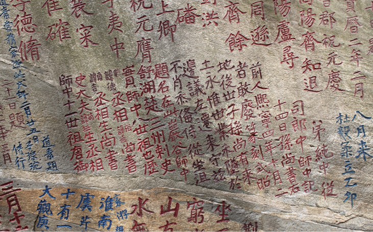 元代以后,眾多游客蜂擁山谷,也留下大量的文字石刻。除了式照唐宋時的題名、題詩以外,在石刻文字的內(nèi)容方面出現(xiàn)一些新的變化,比如出現(xiàn)了大量的用簡短詞語贊嘆山、洞、泉、石景色的特點。同時,石刻文字的體積增大,字徑往往有一、二尺之多,這都是過去所少見的。明代詩人、安慶知府胡纘宗在石牛上大書“石牛”2字,并刊刻了《山谷寺》詩:“摩詩坐山谷,谷水身邊流,篆密龍蛇動,潭空牛女游”, 版權(quán)所有山東聊城聊之旅國際旅行社有限公司,轉(zhuǎn)載必究!此詩十分形象地描繪了石牛臨澗的景色,令人涌不絕口。胡纘宗還有“山谷”大字題刻,字徑2尺。其它像嘉靖時御史大夫李元陽、成化時書法家袁慶祥等人的題名以及大量的“涪涪山谷”、“流云上流”、“天下奇觀”、“水光天色”、“龍門”、“獨醒處”、“安慶名山”、“幽思”等,都有一定的歷史研究與欣賞價值。從書法的角度看,這里的石刻包括有隸書、楷書、草書、篆書、行書等多種,每種書體中又富于變化,各具特色,基本上代表了唐代以來我國書法藝術(shù)發(fā)展演變的風貌,是一處珍貴的書法藝術(shù)寶庫。