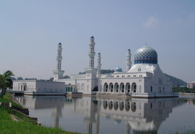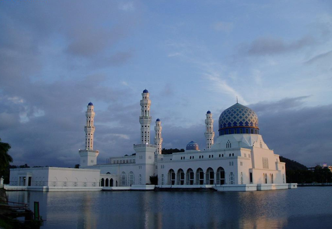哥達(dá)京那巴魯市立清真寺座落在里卡士灣畔(Likas Bay),是一座典型的當(dāng)代伊斯蘭教建筑,是馬來西亞夕陽景觀最壯麗的清真寺之一。它建于里卡士灣的人造湖上,感覺有如浮在水面之上,因而得到“水上清真寺”的美稱。令人驚嘆的白色建筑物造型,與藍(lán)天完美的連成一體。清真寺于1997年建成,占地一公頃,可容納最多12,000名教徒祈禱。