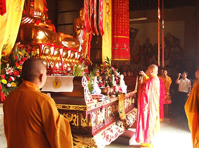 大雄寶殿是法華院的主體建筑,它依山面南而座,殿內(nèi)供奉佛祖釋迦牟尼,因他大智大勇,無敵于邪惡,故人們尊稱其為“大雄”。“大雄寶殿”四個(gè)大字為原全國佛教協(xié)會(huì)會(huì)長(zhǎng)趙樸初先生所題。立于佛祖兩旁分別是他的兩個(gè)弟子大迦葉和阿難尊者 。大殿東、西、北三面墻壁繪有文殊菩薩、普賢菩薩和十八羅漢,壁畫描繪的生動(dòng)、精美。