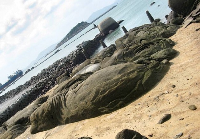 與半洋石帆相對應,在看澳村海邊,由于海水侵蝕和自然風化,巖壁花崗巖風化,形成一座光頭凸肚的彌勒佛像。石像曲膝盤坐,身高12米,肩寬12米,頭、身、手、足畢現(xiàn),形象生動,狀如半浮雕。版權所有山東聊城聊之旅國際旅行社有限公司,轉載必究!圍繞佛身有一條棕黃色的火成巖脈,就象獻給佛像的一條金色“哈達”,也是自然巧合 ,佳趣天成。另外,這里還有許多天然海蝕景觀,例如雙龜接吻,青蛙等,值得一看。