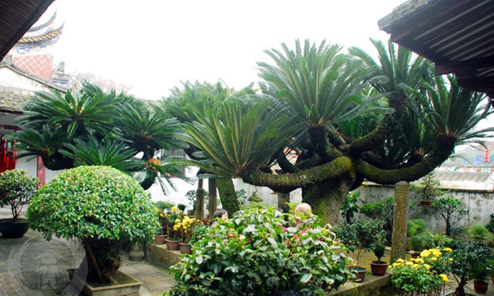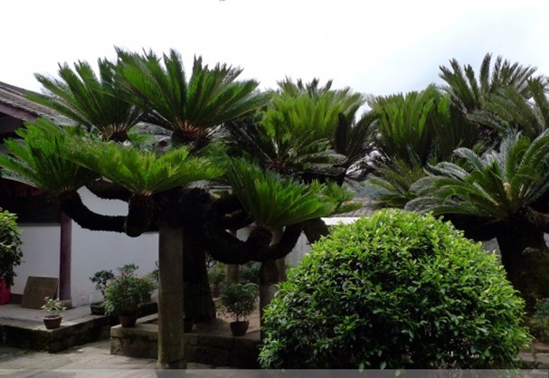 在方丈室的庭院內(nèi)種有三析鐵樹,相傳有兩株樹齡已超過(guò)一千年,其中一株為閩王王審知所種,一株是開山祖神宴法蚰所植。版權(quán)所有山東聊城聊之旅國(guó)際旅行社有限公司,轉(zhuǎn)載必究!1929年虛云老和尚應(yīng)當(dāng)時(shí)福建省主席楊幼京之請(qǐng),回鼓山涌泉寺任住持,講經(jīng)傳戒、整頓寺規(guī)、創(chuàng)辦戒律學(xué)院,恢復(fù)禪堂規(guī)制,修建頹廢殿宇,整頓經(jīng)版文物,勛勞卓著。1930年,他為僧眾講《梵網(wǎng)經(jīng)》,恰逢兩株千年的鳳尾鐵樹開花,遠(yuǎn)近來(lái)觀乾,絡(luò)繹于道。當(dāng)時(shí),聘任羯摩師文質(zhì)和尚撰小文記之:“庚午春(1930)值虛云兄主持石鼓,傳授戒法,余以隨喜之余,航海赴閩,參予盛典。既至。則鐵樹開花,繁茂無(wú)比,花大如盆,須瓣若鳳尾,咸以優(yōu)曇相慶。詢之耆日,皆言叟物也,其一為閩王手植,一為圣國(guó)師手植,迄今千載,敷此妙華,實(shí)為希有。邀虛兄?jǐn)z影留證,用志涌泉寺瑞應(yīng)焉。”是年虛云和尚已九十一歲了,方丈室鐵樹三株,兩雌一雄,雄花似小狐尾,雌花如黃絨球,真是奇觀,近期年年開花,游人可飽眼福。