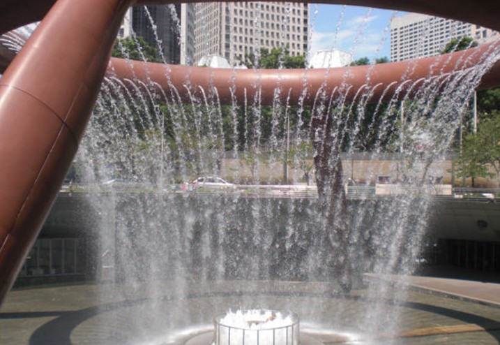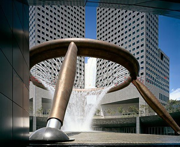 財(cái)富噴泉是由四根傾斜的青銅巨柱組成,柱頂是一個(gè)直徑66米的青銅圓環(huán),整個(gè)結(jié)構(gòu)垂直高度13.8米。整個(gè)噴泉占地1683.07平方米,噴出的水柱可達(dá)30米。
