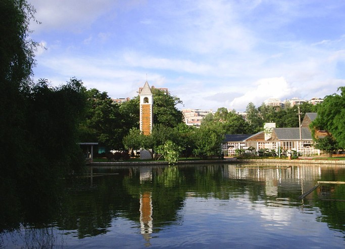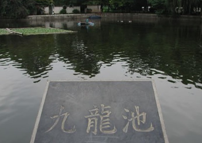 位于玉溪市州城西北10公里奇黎山下的九龍池,又名奇黎溪, 是當(dāng)?shù)刂募丫皠俚刂弧?據(jù)《重修九龍池碑記》載, 寺廟初創(chuàng)于清朝之前, 幾經(jīng)擴(kuò)建,到公元1729年(雍正七年),又“新作石橋,長(zhǎng)虹臥波,幾于騰空直上。繼修大寺閣,燃然一新,儼若普陀”??梢?jiàn), 200多年前,九龍池廟宇已頗具規(guī)模。 九龍池風(fēng)光,最吸引人的地方,首先是那潭十分清澈明凈的池水。乾隆《新興州志》描寫(xiě)其水,從“巖石間潺潺流出,聚為一泓,清可鑒發(fā)”。不論春夏秋冬,無(wú)數(shù)游魚(yú),搖尾相戲。晴日,池旁斑駁的樹(shù)影清晰如畫(huà)地印在池中;微風(fēng)吹來(lái),則漣漪輕蕩,樹(shù)影碎散,魚(yú)群晃動(dòng),別有佳趣。有池子四周,設(shè)有欄桿。 池上,一橋飛跨正中,橋洞門(mén)頭上,刻有“九龍池”三字。龍?zhí)兜某鏊?,比本地其他泉池,都要大得多,歷來(lái)是灌溉玉溪壩子“四十二屯”萬(wàn)畝良田的重要水源之一。故前人有詩(shī)吟道:“山滿青光水滿池,滔滔利澤本無(wú)私。未知百里臨民侯,可似九龍作雨時(shí)。”九龍池的山巖峭壁聳峙, 層巒疊嶂。 沿著池畔臺(tái)階拾級(jí)而上,在險(xiǎn)峻的林壑之巔,建有樓臺(tái)亭閣,雕梁畫(huà)棟,金碧輝煌。大觀樓、聽(tīng)泉樓、三圣閣、大士閣、文星閣等,均有詩(shī)詞對(duì)聯(lián)可以觀賞。“欲窮千里目,更上一層樓”。文星閣位置最高,巍峨矗立,直插云霄。只要登樓遠(yuǎn)眺,眾山皆小,翡翠般的玉溪壩子,可盡收眼底。遠(yuǎn)處山川,連綿不絕,此起彼伏; 星羅棋布的村舍,縷縷炊煙,裊裊升起;縱橫交錯(cuò)的林蔭大道,車水馬龍,往返不息。視近處,龍池周圍,古木參天,郁郁蔥蔥,鳥(niǎo)語(yǔ)花香,林濤陣陣。池子?xùn)|邊的平場(chǎng)上,有古戲臺(tái)一座,至今尚存。歷史上,每年春節(jié)在此大鬧花燈是個(gè)傳統(tǒng)。四面八方來(lái)游玩的人,真是人山人海。 除池、 亭、 山、水之外,九龍池還有上中下松園,三園相近。園內(nèi)的云南巨松,拔地而起,蒼勁挺拔,高達(dá)十?dāng)?shù)丈,相傳為明代寺內(nèi)老僧所值。座落在龍池下面的飛井海(水庫(kù)),水面寬闊,碧波如玉。西岸的農(nóng)村,坡坡桃林,處處綠蔭。山道彎彎,阡陌相連。當(dāng)盛產(chǎn)飛井桃,其味甜美,遠(yuǎn)近聞名。近年來(lái),當(dāng)?shù)厝嗣裾畵芸钸M(jìn)行修復(fù),建立了專門(mén)管理林園機(jī)構(gòu),使古老的九龍池恢復(fù)了青春。