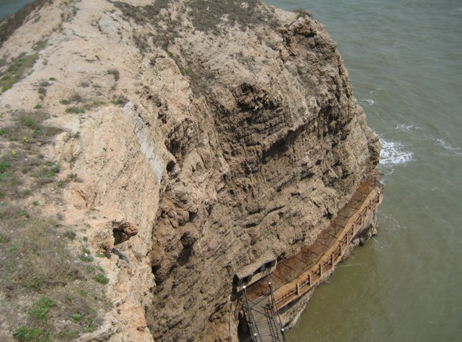 這里是被稱(chēng)為膠東一絕的田橫棧道。棧道全長(zhǎng)220米,高2米,離崖壁地面20米,東起回仙洞,西抵老虎洞。